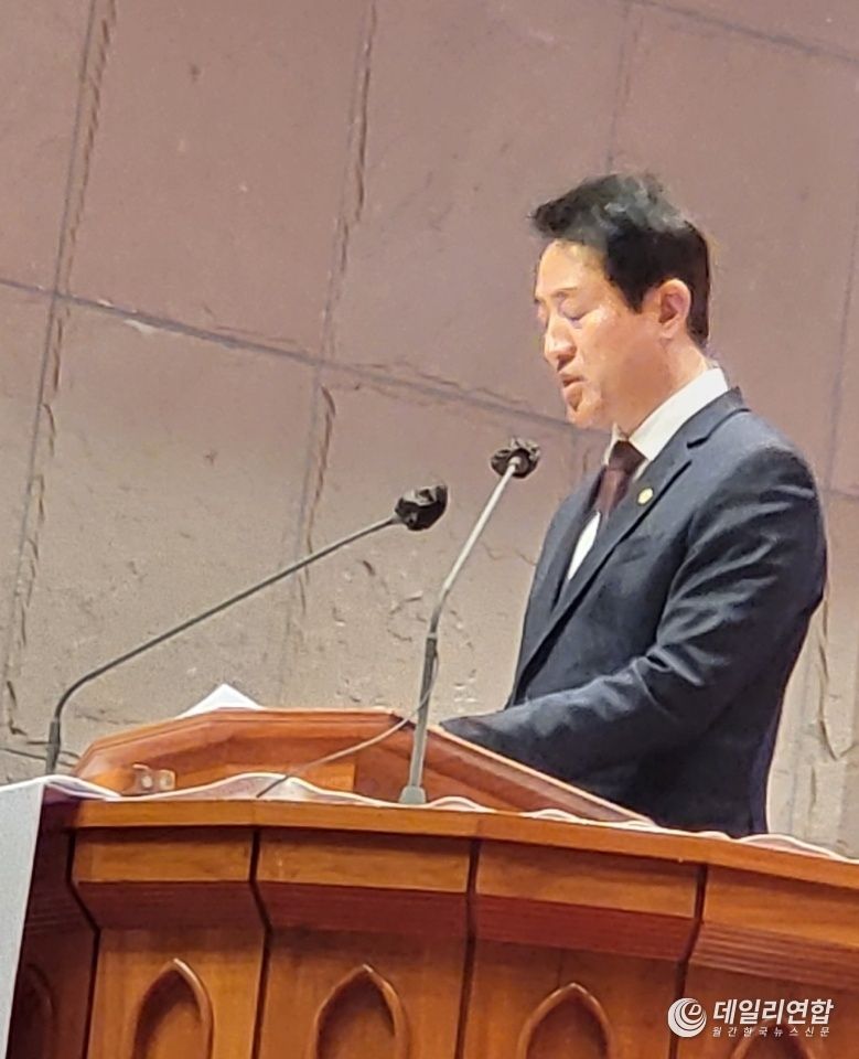 지난 국회조찬기도회 회장을 역임한 수원 중앙침례교회 장로, 김진표 국회의장과 오세훈 서울시장, 강연홍 목사(기장 총회장)가 축사했다.