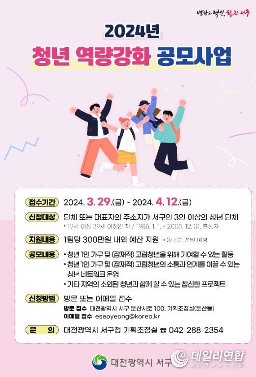 데일리연합(월간, 한국뉴스신문) 정호영기자 기자 | 대전 서구가 청년의 사회적 역량 강화를 위한 ‘2024년 청년 역량강화 공모사업’을 추진한다.