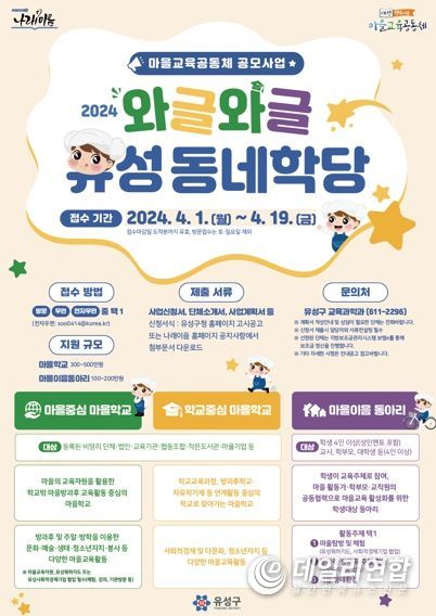데일리연합(월간, 한국뉴스신문) 정호영기자 기자 | 대전 유성구는 나래이음 교육지구사업의 일환으로 마을교육활동 지원 체계 강화를 위한 ‘마을교육공동체 와글와글 유성동네학당 공모 사업’을 추진한다.