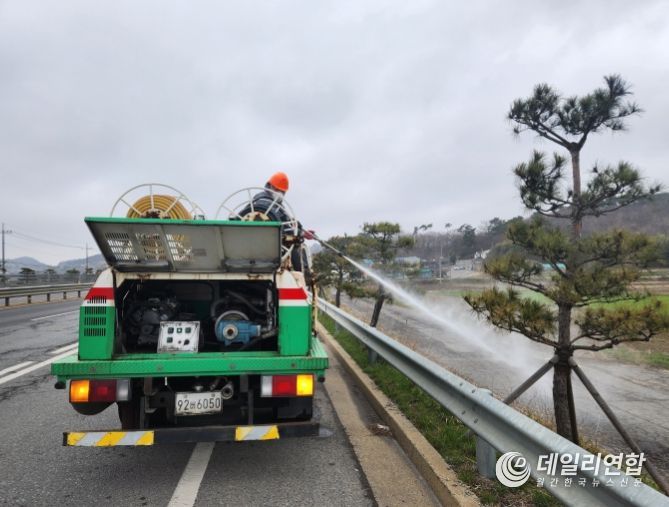 이번 살포 대상 수목은 태안 방면의 국도 32호선 내 식재된 소나무 가로수 약 1,400주로 시는 염분 중화제를 100배 희석해 가로수 잎 표면과 줄기에 살포하고 오염 물질 등을 제거할 예정이다.