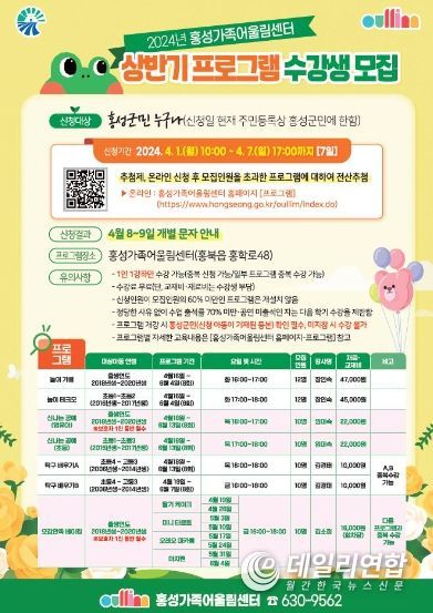 데일리연합(월간, 한국뉴스신문) 정호영기자 기자 | 홍성가족어울림센터는 관내 유아 및 초·중·고등학생을 대상으로 2024년 상반기 프로그램 수강생을 모집한다고 1일 밝혔다.