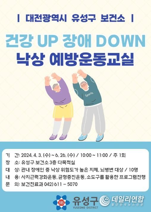 데일리연합(월간, 한국뉴스신문) 정호영기자 기자 | 대전 유성구는 관내 낙상 위험도가 높은 지체, 뇌병변 장애인을 대상으로 오는 3일부터 6월 26일까지 상반기 ‘건강UP 장애DOWN 낙상예방운동교실’을 운영한다.