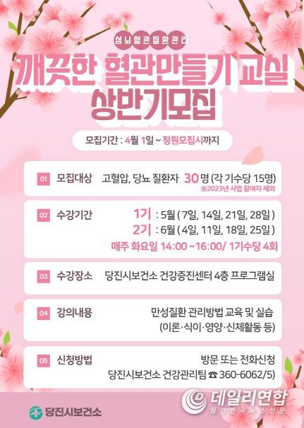 데일리연합(월간, 한국뉴스신문) 정호영기자 기자 | 당진시보건소는 4월 1일부터 4월 19일까지 2024년 상반기 ‘깨끗한 혈관 만들기 교실’ 참여자를 모집한다.
