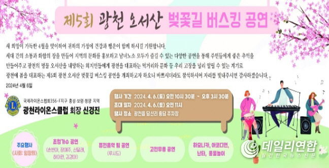 신경진 광천라이온스클럽회장은 “다양한 공연이 준비되어 있으니 가족과 연인, 친구와 함께 오서산을 찾아 벚꽃과 버스킹 공연을 즐기며 봄날의 낭만을 느껴보시길 바란다.”고 말했다.