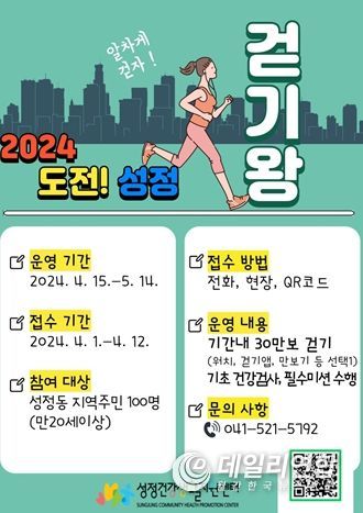데일리연합(월간, 한국뉴스신문) 정호영기자 기자 | 천안시 서북구보건소 성정건강생활지원센터는 오는 15일부터 성정동 지역주민을 대상으로 규칙적인 신체활동 실천 기회를 제공하고자 ‘2024 도전! 성정 걷기왕’을 운영한다.