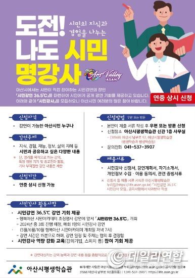 데일리연합(월간, 한국뉴스신문) 정호영기자 기자 | 아산시는 시민의 지식과 경험을 나누는 '시민 강연 36.5℃' 강연자로 참여할 시민 강사를 모집한다.