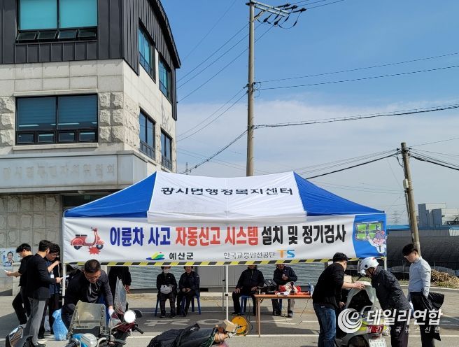 데일리연합(월간, 한국뉴스신문) 정호영기자 기자 | 예산군은 이륜차 사고자동신고 시스템 시범사업으로 사고자동신고 장치 270대를 설치하고 한국교통안전공단과 협업해 사고 예방을 위한 시스템 설치 대상자의 이륜차에 대해 등화장치, 제동장치, 조향장치 등 안전점검을 진행했다.