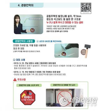 강기원 소방서장은 “공동주택 경량칸막이는 화재 발생 시 생명을 지켜주는 비상구”라며 “안전을 위해 만들어진 경량칸막이의 사용법을 정확히 숙지해 나 자신과 우리 가족의 안전을 지키기 바란다”라고 전했다.