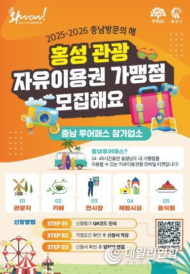 데일리연합(월간, 한국뉴스신문) 정호영기자 기자 | 홍성군이 ‘2025-2026 충남 방문의 해’를 맞아 홍성군의 다양한 관광지와 음식점, 카페 등을 연계한 할인 패스권인 ‘충남 투어패스’ 홍성군 지역 참여 가맹점을 모집한다.