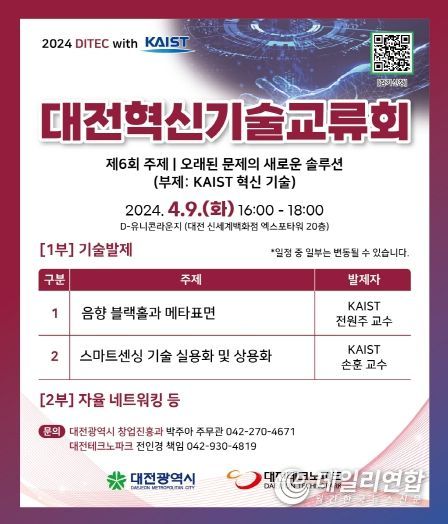 교류회는 창업기업인을 포함, 시민 누구나 참여할 수 있으며 신청은 네이버폼 또는 포스터 상단 QR코드로 가능하며, 자세한 문의는 대전테크노파크 기술사업화팀로 하면 된다.