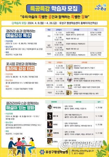 데일리연합(월간, 한국뉴스신문) 정호영기자 기자 | 대전 유성구는 오는 4월 8일부터 26일까지 마을의 특별한 공간을 연계한 특별한 강좌 '특공특강'참여자를 모집한다.