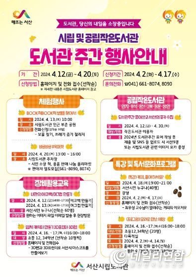 데일리연합(월간, 한국뉴스신문) 정호영기자 기자 | 충남 서산시는 4월 도서관 주간을 맞아 지역 주민들을 위한 다양한 독서문화 프로그램을 운영한다고 8일 밝혔다.