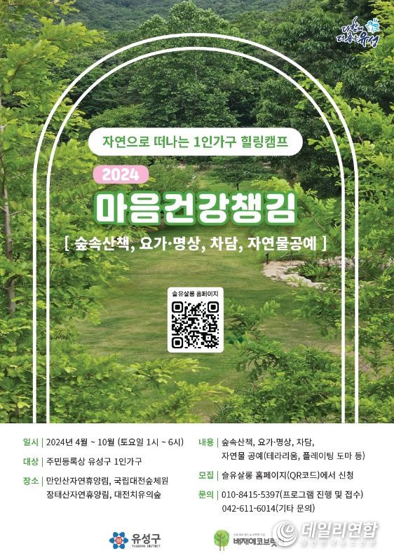 데일리연합(월간, 한국뉴스신문) 정호영기자 기자 | 대전 유성구가 4월부터 10월까지 1인가구 숲속 힐링캠프 '마음건강챙김'사업을 추진한다.