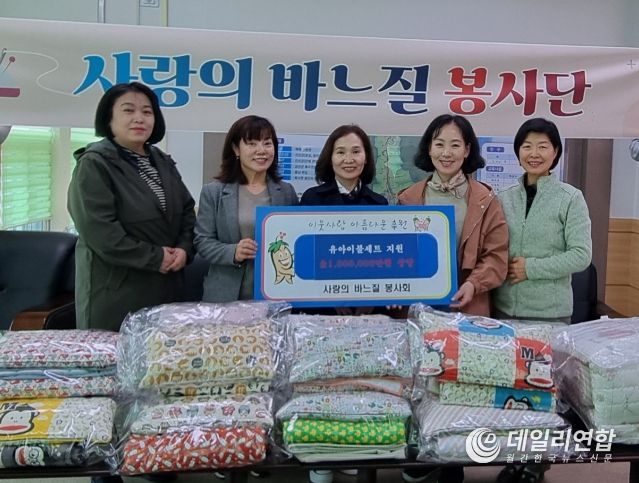데일리연합(월간, 한국뉴스신문) 정호영기자 기자 | 사랑의바느질봉사회(회장 서영희)는 지난 5일 복수면행정복지센터를 방문해 100만 원 상당의 유아 이불세트를 기증해 주위를 훈훈하게 하고 있다.