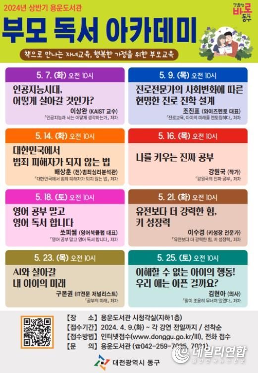 데일리연합(월간, 한국뉴스신문) 정호영기자 기자 | 대전 동구는 부모 교육 전문 강사를 초청해 5월 한 달간 총 8회에 걸쳐 ‘2024년 상반기 부모 독서 아카데미’를 개최한다고 8일 밝혔다.