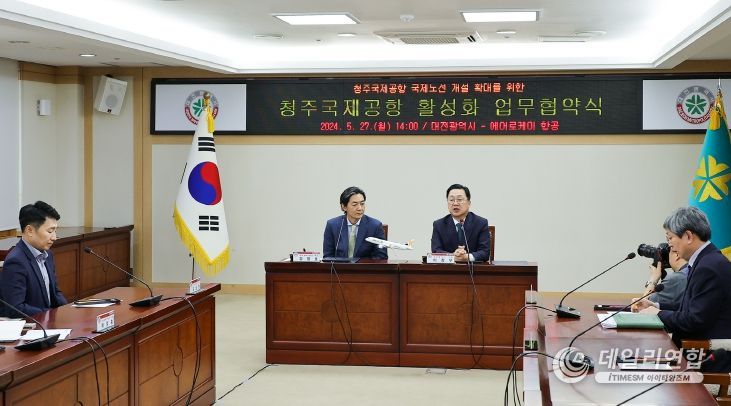 데일리연합 (아이타임즈M 월간한국뉴스신문) 기자 | 대전시와 에어로케이 항공사는 27일 ‘국제노선 개설 확대를 위한 청주국제공항 활성화 업무협약’을 체결했다.