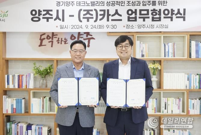 강수현 양주시장이 24일 오전 시청 2층 시장실에서 ‘㈜카스(대표 김태인)’의 ‘경기양주 테크노밸리(이하 양주테크노밸리)’ 입주 및 상호협력을 위한 업무협약을 체결했다.