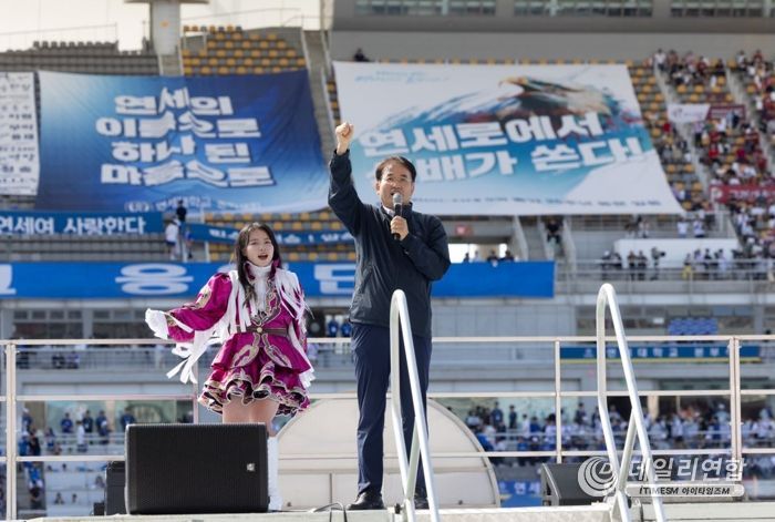 이 시장은 경기 시작 전 양교 응원단상에 올라 학생 및 동문들을 향해 승리를 위한 응원 메시지를 전달하고, 시축으로 경기 시작을 알렸다.