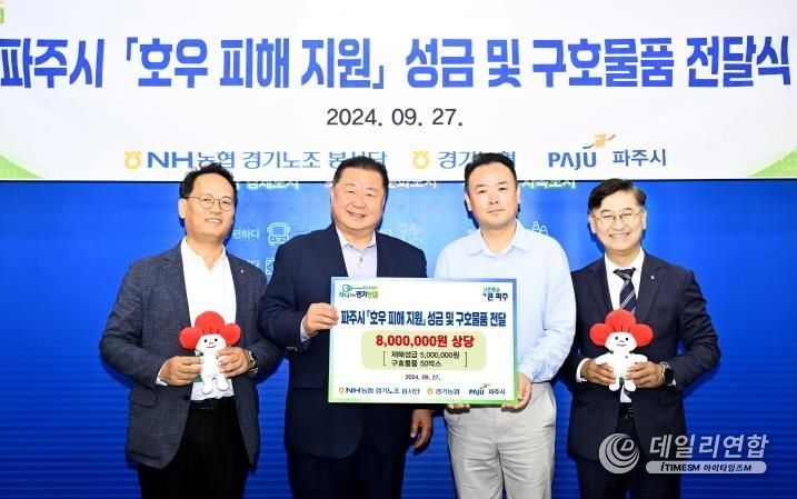 데일리연합 (SNSJTV. 아이타임즈M) 주기범 기자 | 파주시는 지난 27일 농협지부 경기노조으로부터 재해성금 500만 원과 구호물품 50박스를 전달받았다고 밝혔다.