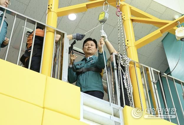 이날 교육에서는 완강기 사용법 영상 시청 및 이론교육, 실제 완강기를 사용한 화재 대피 체험훈련 등이 진행됐으며 조 시장을 비롯해 송재환 부시장, 국장급 공무원 10여 명 등이 참여했다.