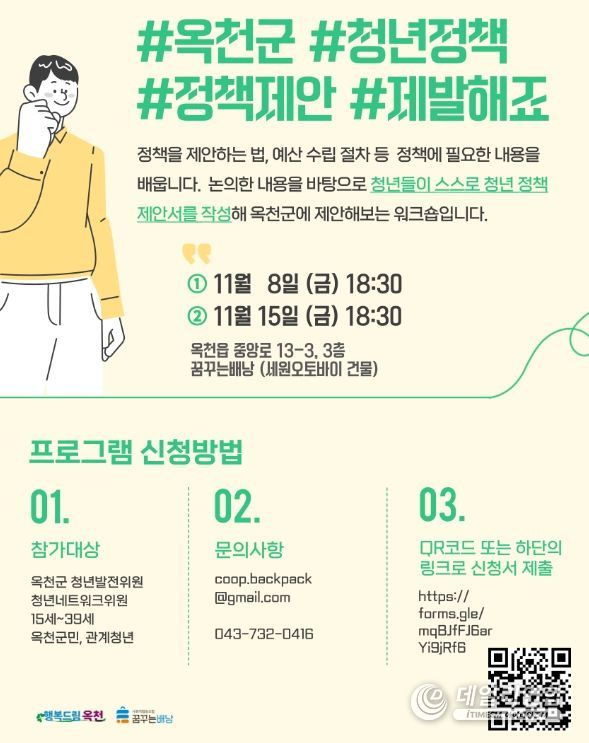 데일리연합 (SNSJTV. 아이타임즈M) 이성용 기자 | 옥천군은 11월 8일,15일 2회에 걸쳐 옥천읍 중앙로 13-3, 3층 꿈꾸는배낭에서 청년 역량 강화 워크숍을 개최한다.