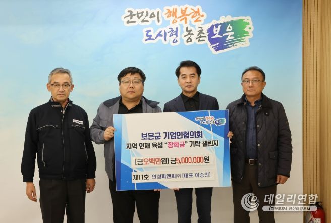 데일리연합 (SNSJTV. 아이타임즈M) 이성용 기자 | 보은산업단지 내 입주 기업 인성피앤씨(주)(이숭인 대표)는 15일 보은군청을 방문해 지역 인재 육성에 사용해 달라면 장학금 500만 원을 보은군민장학회에 기탁했다.