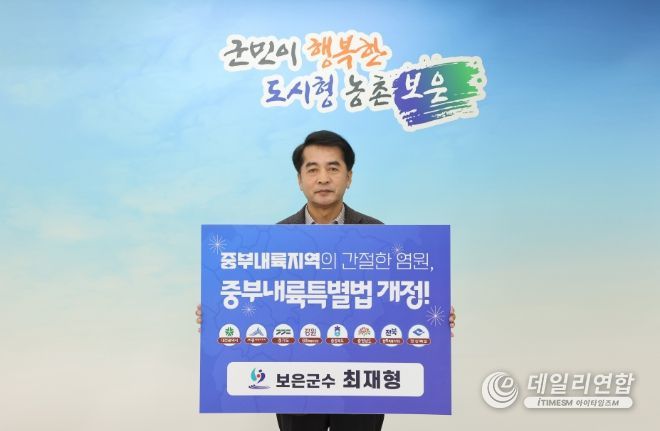 데일리연합 (SNSJTV. 아이타임즈M) 이성용 기자 | 최재형 보은군수는 22일 중부내륙연계발전지역 지원에 관한 특별법 개정 챌린지에 동참하며 특별법 개정의 필요성을 알렸다.