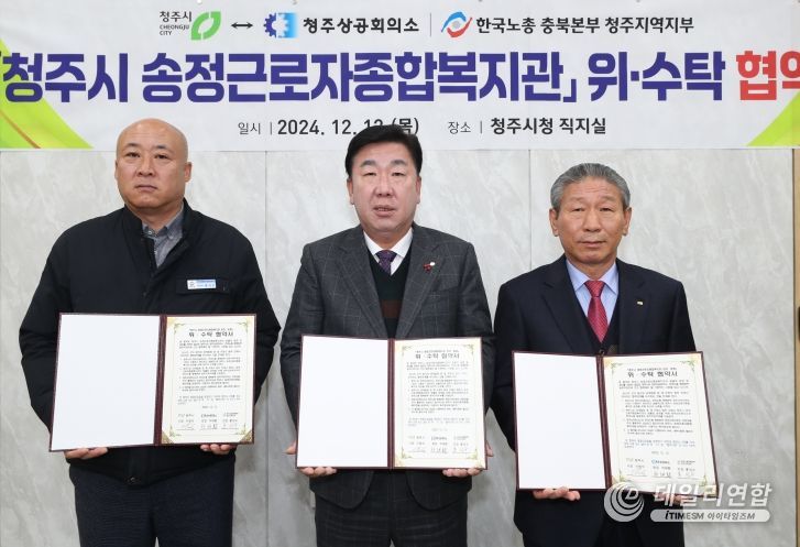 데일리연합 (SNSJTV. 아이타임즈M) 이성용 기자 | 청주시는 12일 청주상공회의소, 한국노총 충북본부 청주지역지부와 청주시 송정근로자종합복지관 운영‧관리에 대한 위‧수탁 협약을 체결했다.