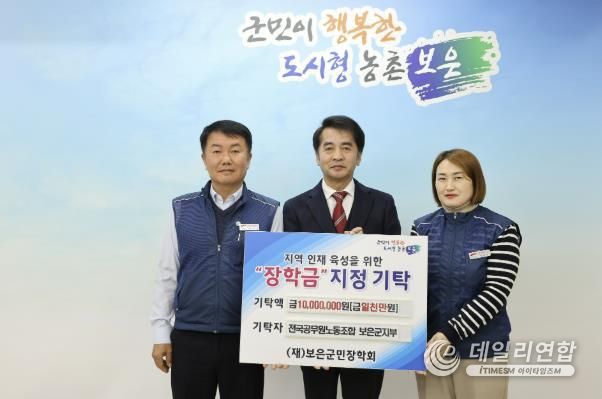 데일리연합 (SNSJTV. 아이타임즈M) 이성용 기자 | 보은군공무원노조는 지난 18일 지역인재 육성을 위해 사용해 달라며 장학금 1,000만 원을 (재)보은군민장학회에 기탁했다.