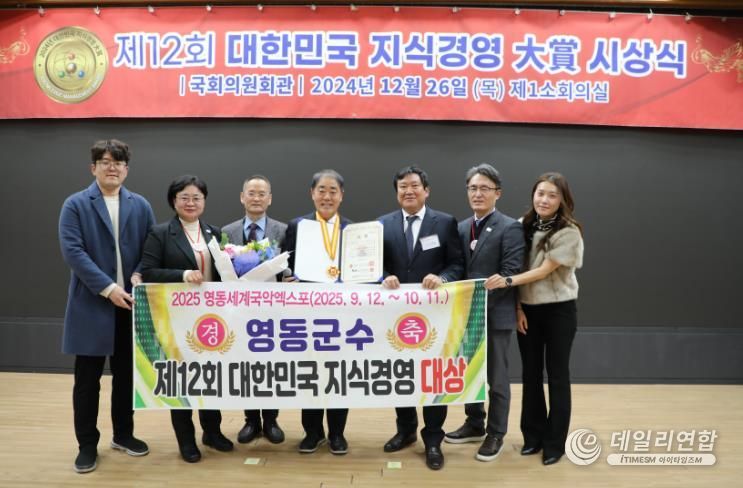 데일리연합 (SNSJTV. 아이타임즈M) 이성용 기자 | 충북 영동군이 26일 국회의원회관에서 열린 ‘제12회 대한민국 지식경영 포럼’에서 FIRST MOVER 지방자치 국악발전 부문 대상을 수상했다.