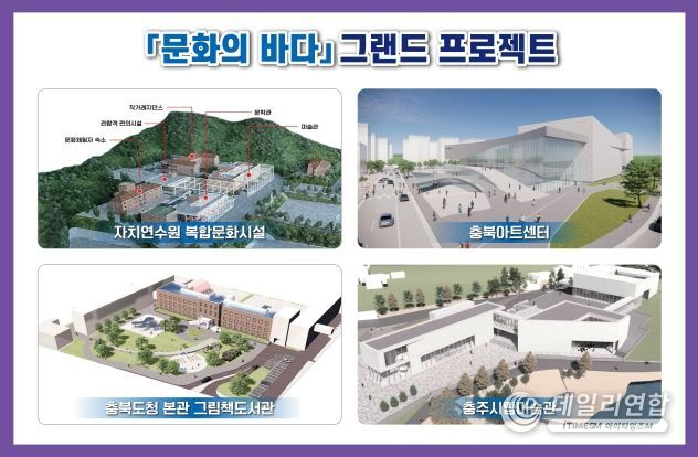 문화의 바다 그랜드 프로젝트에는 자치연수원을 활용한 미술관, 문학관, 작가 레지던스 등 문화복합시설 조성, 대규모 공연장인 충북아트센터 건립, 도청 본관의 그림책 도서관 등 복합문화공간이 포함된다.