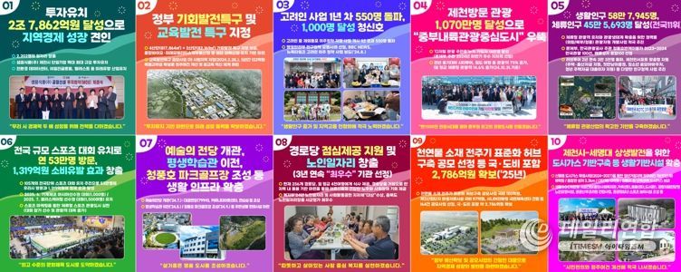 시가 선정한 10대 성과는 ▲투자유치 2조 7,862억원 달성으로 지역경제 성장 견인 ▲정부 기회발전특구 및 교육발전 특구 지정 ▲고려인 사업 1년 차 550명 돌파, 1,000명 달성 청신호 ▲제천방문 관광 1,070만명 달성으로 ‘중부내륙관광중심도시’ 우뚝 ▲생활인구 58만 7,945명, 체류인구 45만 5,693명 달성(전국11위) ▲전국 규모 스포츠 대회 유치로 연 53만명 방문, 1,319억원 소비유발 효과 창출 ▲예술의 전당 개관, 평생학습관 이전, 청풍호 파크골프장 조성 등 생활 인프라 확충 ▲경로당 점심제공 지원 및 노인일자리 창출(3년 연속 ‘최우수’ 기관 선정) ▲천연물 소재 전주기 표준화 허브 구축 공모 선정 등 국·도비 포함 2,786억 원 확보('25년) ▲제천시 세명대 상생발전을 위한 도시가스 기반구축 등 생활기반시설 확충 등이다.