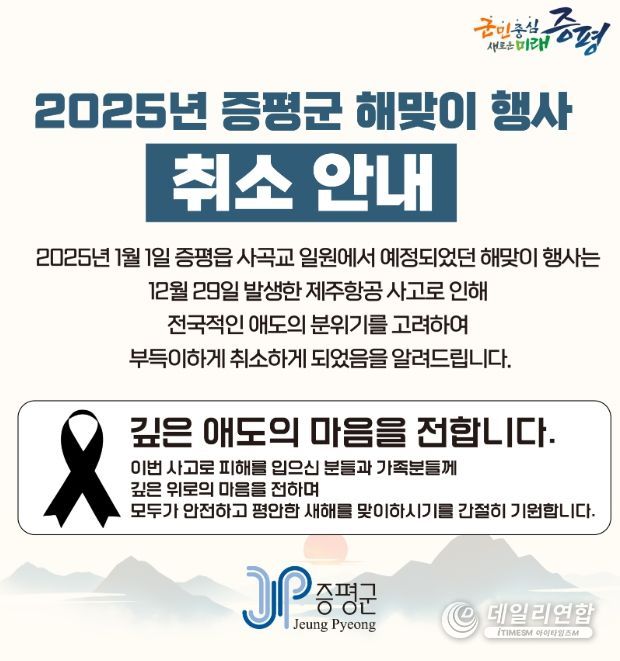 데일리연합 (SNSJTV. 아이타임즈M) 이성용 기자 | 충북 증평군은 내년 1월 1일 오전 7시에 증평읍 사곡교 일원에서 예정됐던 해맞이 행사를 취소한다고 30일 밝혔다.