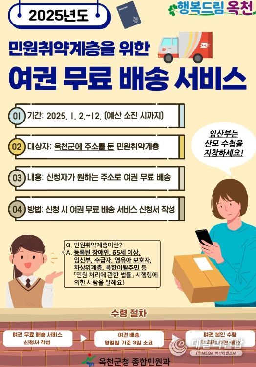 데일리연합 (SNSJTV. 아이타임즈M) 이성용 기자 | 옥천군은 민원 취약계층의 행정 서비스 접근성을 높이고 민원 처리의 편의를 증진하기 위해 여권 무료 배송 서비스를 2025년 1월부터 도입한다고 밝혔다.