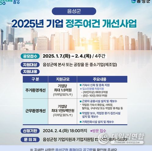 데일리연합 (SNSJTV. 아이타임즈M) 이성용 기자 | 음성군은 지역 중소기업의 정주 여건 개선을 통해 기업 경쟁력을 높이고, 근로자들의 안전하고 쾌적한 근무 환경을 조성하기 위해 오는 2월 4일까지 ‘2025년 기업 정주여건 개선사업’ 신청을 받는다.
