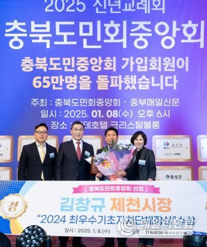 데일리연합 (SNSJTV. 아이타임즈M) 이성용 기자 | 김창규 제천시장이 지난 8일 서울 롯데호텔에서 개최된 ‘2025충북도민회중앙회 신년교례회’에서 ‘최고 자치단체장’ 대상을 받았다.
