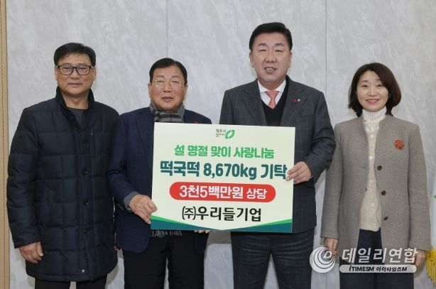 데일리연합 (SNSJTV. 아이타임즈M) 이성용 기자 | ㈜우리들기업(대표 이무석)은 설 명절을 앞둔 16일 청주시청을 찾아 지역의 어려운 이웃들에게 전해달라며 3천500만원 상당의 떡국 떡 8천670kg을 기탁했다.