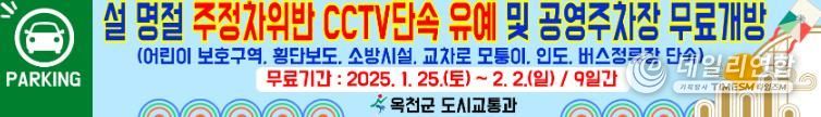 데일리연합 (SNSJTV. 타임즈M) 이성용 기자 | 옥천군은 설 명절을 맞아 1월 25일부터 2월 2일까지 9일간 지역 주민과 귀성객의 주차 편의 및 지역경제 활성화를 위해 주․정차 단속을 한시적으로 유예하고, 유료로 운영 중인 공영주차장을 무료 개방한다.