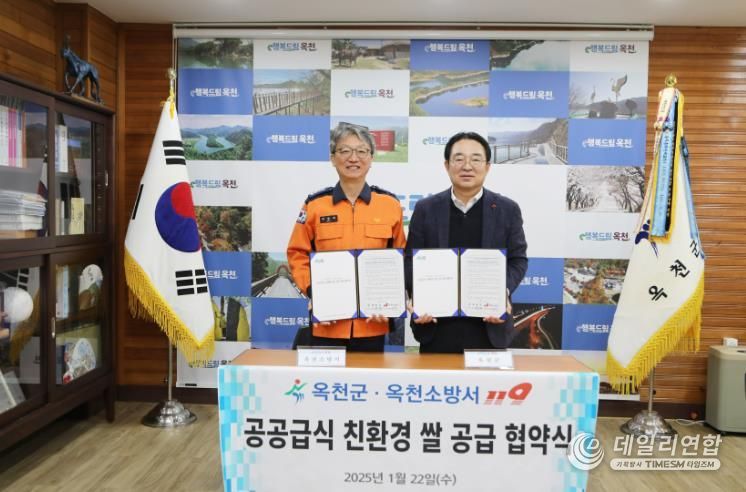 데일리연합 (SNSJTV. 타임즈M) 이성용 기자 | 옥천군은 옥천소방서와 공공급식 친환경 쌀 공급 협약식을 체결했다고 22일 밝혔다.