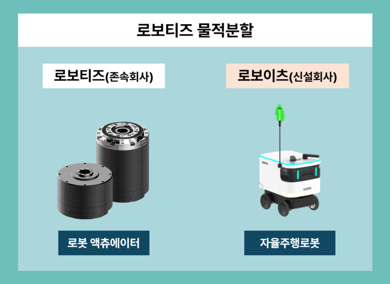 이번 물적분할의 핵심은 자율주행로봇 사업부를 독립적인 법인으로 분리하는 것이다. 물적분할이란 기존 회사(로보티즈)에서 특정 사업부(자율주행로봇)를 떼어내 새 회사(로보이츠)를 설립하되, 기존 회사가 신설 법인의 지분 100%를 보유하는 방식이다. 즉, 기존 투자자들이 자율주행로봇 사업부의 지분을 간접적으로 보유하게 되는 구조다.