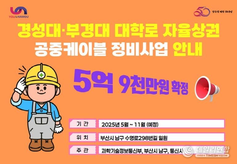데일리연합 (SNSJTV. 타임즈M) 박영우 기자 | 부산 남구는 경성대·부경대 대학로 상권 활성화 대상지(자율상권구역)에 공중케이블 정비사업이 확정되어, 오는 5월 이후 통신사별로 본격적인 사업에 착수한다고 밝혔다.
