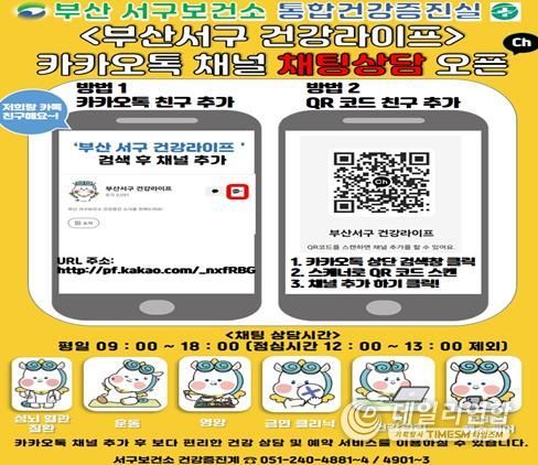데일리연합 (SNSJTV. 타임즈M) 박영우 기자 | 부산 서구는 지역 보건의료서비스의 접근성을 높이기 위해 4월부터‘서구보건소 통합건강증진실 카카오톡 채널 '부산 서구 건강 라이프' 채팅 상담' 서비스를 새롭게 열었다고 밝혔다.