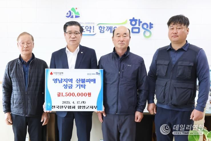 데일리연합 (SNSJTV. 타임즈M) 이동수 기자 | 전국한우협회 함양군지부는 4월 17일, 최근 발생한 대형 산불로 특별재난지역으로 선포된 경남 지역의 한우농가와 주민들의 피해 복구를 지원하기 위해 성금 150만 원을 기탁했다.
