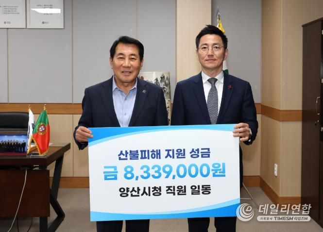 데일리연합 (SNSJTV. 타임즈M) 이동수 기자 | 양산시는 17일 오후 시장 집무실에서 산불 피해 주민들을 돕기 위한 모금성금 8,339,000원을 경남사회복지공동모금회에 전달했다.