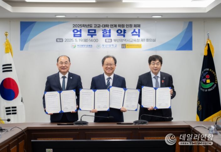 데일리연합 (SNSJTV. 타임즈M) 김준 기자 | 부산광역시교육청은 19일 오후 2시 교육청 제1회의실에서 부산대학교, 부산외국어대학교와 ‘2025학년도 고교-대학 연계 학점 인정 체제 업무 협약’을 체결했다.
