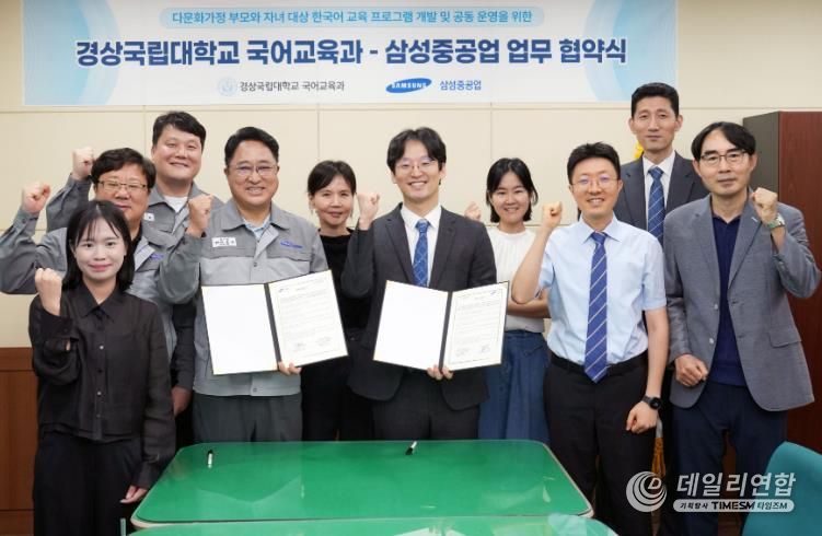 데일리연합 (SNSJTV) 이동수 기자 | 경상국립대학교 사범대학 국어교육과와 삼성중공업은 9월 4일 오후 가좌캠퍼스 언어교육실에서 거제시 삼성중공업에 재직하는 외국인 근로자 가족을 위한 글로벌학교를 만들기 위해 업무협약(MOU)을 체결했다.
