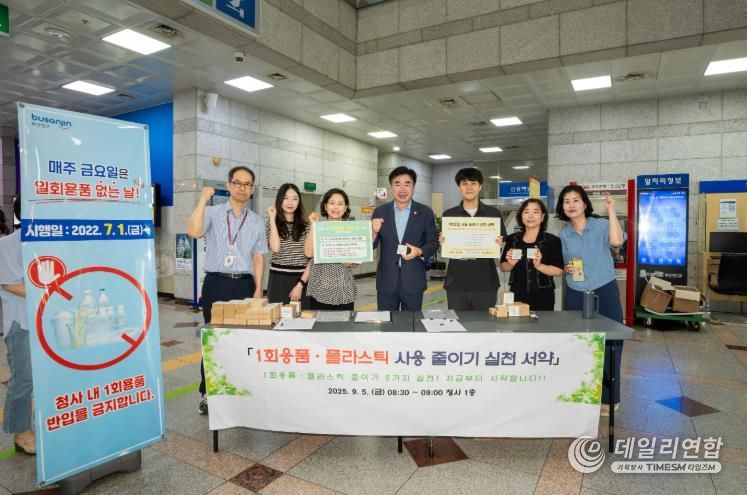 데일리연합 (SNSJTV) 박영우 기자 | 부산 부산진구는 지난 5일 ‘1회용품·플라스틱 사용 줄이기 실천 서약’ 캠페인을 청사 내 1층 로비에서 진행했다.