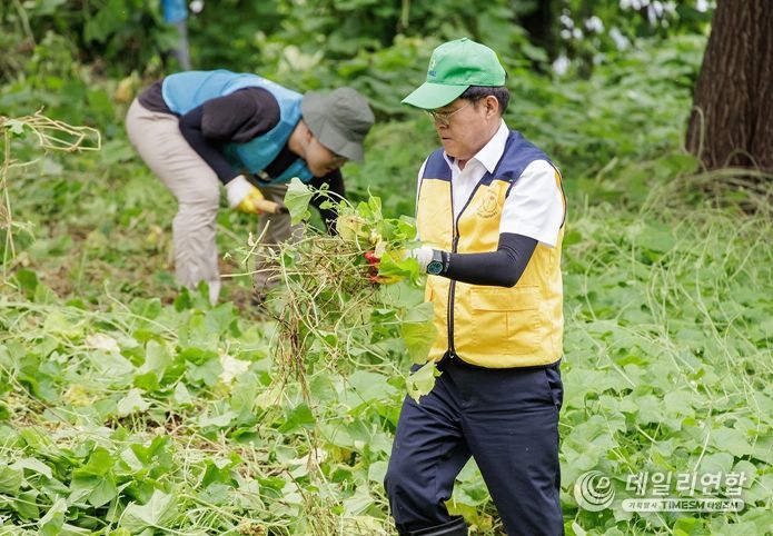 진 구청장도 장화, 목장갑, 낫, 노란 봉사조끼로 작업 채비를 갖춘 채 1시간가량 현장을 누비며 구슬땀을 흘렸다.