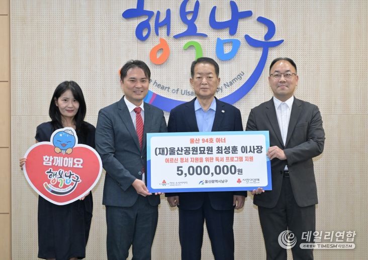 데일리연합 (SNSJTV) 장우혁 기자 | (재)울산공원묘원 최성훈 이사장은 8일 남구청을 방문해 지역 어르신들의 정서적 건강 증진을 위한 이웃돕기 성금 500만 원을 전달했다.