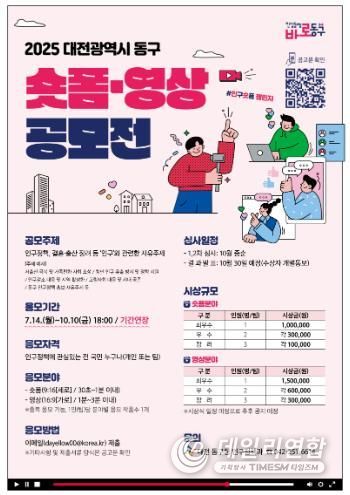 데일리연합 (SNSJTV) 임재현 기자 | 대전 동구는 인구감소 위기에 대한 공감대 확산과 구의 인구정책 홍보를 위해 추진 중인 ‘2025 동구 인구정책 숏폼·영상 공모전’의 접수 기간을 당초 9월 12일에서 10월 10일까지로 연장한다고 9일 밝혔다.